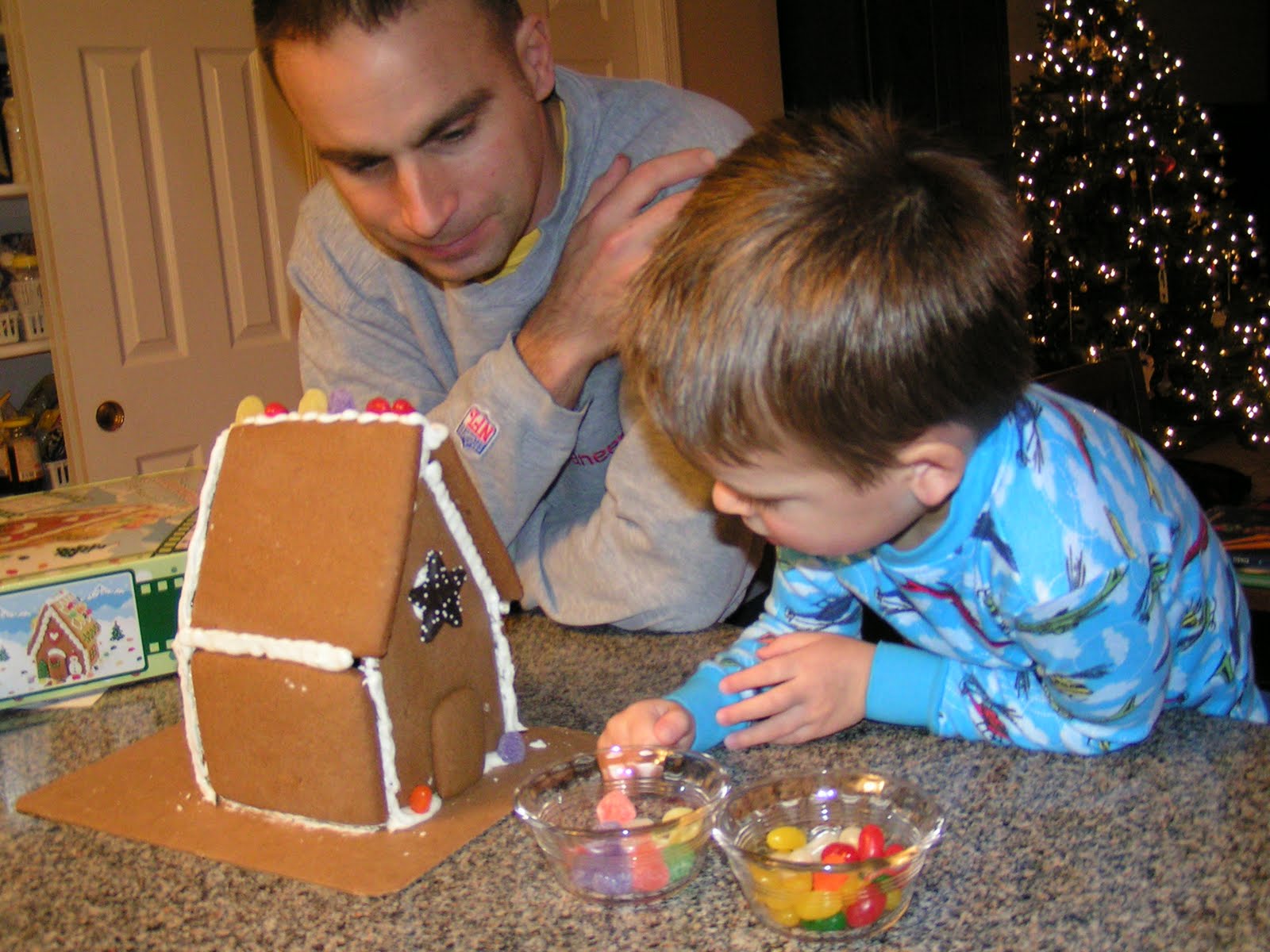 This year I decided that Jackson was probably old enough to decorate a gingerbread house, and at least be a little interested in doing it. So last night after dinner we got down to business!! Thanks to my friend Amy, I used her little trick of gluing the house together and not just using the icing. We tried using the icing first, but it wasn't holding at all! May have been operator error....I can't really say....but anyway, we finally got the house to stand. Meanwhile, Jackson was "sampling" the icing and candy with no end in sight. I am surprised he didn't have a stomach ache all night long. He was a bit wound up when it came time to go to bed. Oh well, it was a special occasion. Jackson had a blast putting the gumdrops and jelly beans on the house. Joe and I had a pretty good time too. I don't thin it will be winning any awards, but we love the finished product and had a fun time!